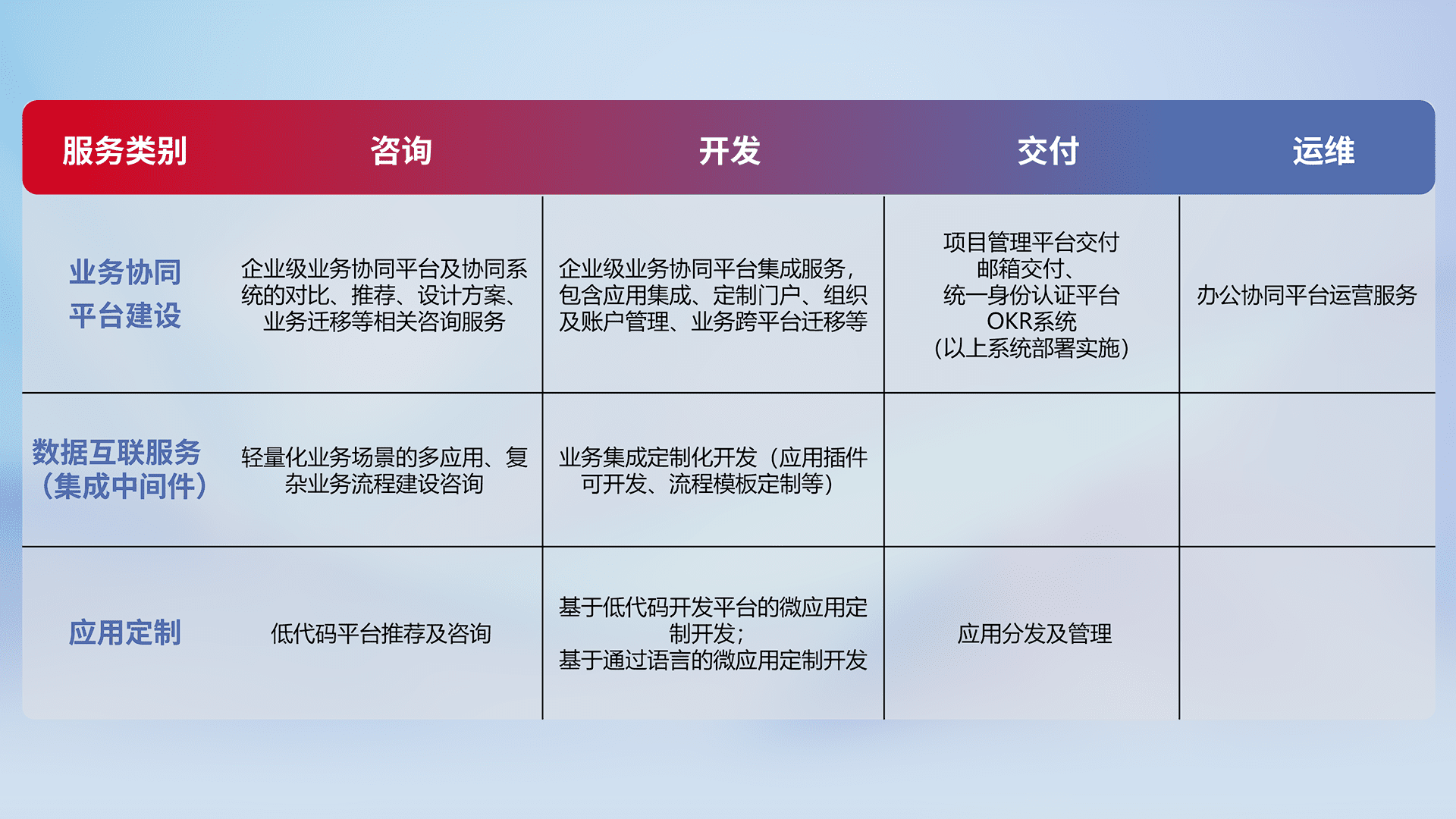 针对钉钉、、、企微、、IDaas等平台级产品提供产品的规划、、、方案、、、交付、、定制化开发等服务,,,,实现如统一协同办公、、、智能客户服务、、混合会议管理、、智能数据查询、、、等业务场景,,,实现数字化转型。。。