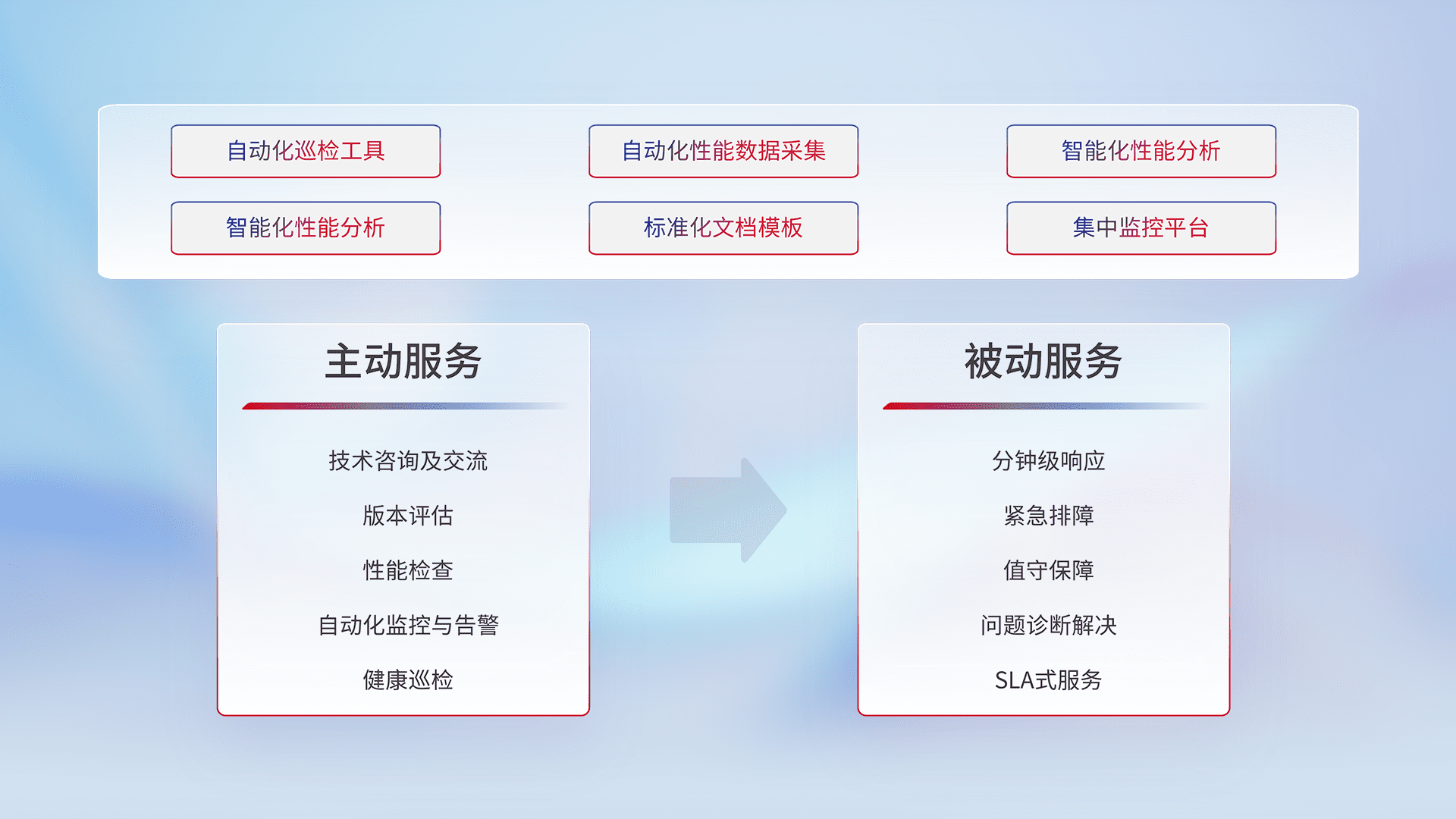 智能化工具和标准化文档,,,,保障服务质量,,提供主动服务(包含技术咨询、、、、版本评估、、、、性能检查、、、自动化监控与告警、、健康巡检)和被动服务包含(分钟级响应、、紧急排障、、值守保障、、、问题诊断解决、、、SLA服务)。。